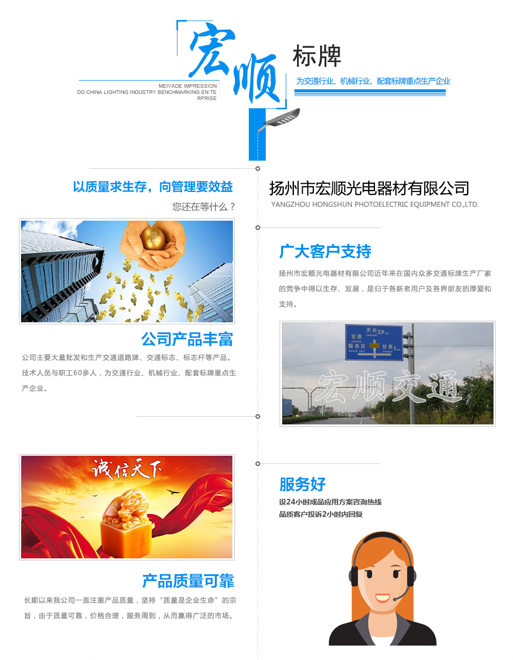 揚州市宏順光電器材有限公司近年來在國內(nèi)眾多交通標牌生產(chǎn)廠家的競爭中得以生存、發(fā)展,是歸于各新老用戶及各界朋友的厚愛和支持。我們?nèi)w員工向你們致以誠摯的感謝。 為使我們共同步入新世紀,提高我們的產(chǎn)品質(zhì)量與服務(wù)希望對我們提出寶貴的意見,使我們不斷改進、創(chuàng)新。 我們將和過去一樣,視今天的質(zhì)量為明天的市場。為您奉獻滿意的各種精品,為美化我們的交通事業(yè)做出貢獻。 公司主要大量批發(fā)和生產(chǎn)道路交通標志牌、道路指示牌、交通標志牌、指路牌、反光標志牌等產(chǎn)品。技術(shù)人員與職工60多人,為交通行業(yè)、機械行業(yè)、配套標牌重點生產(chǎn)企業(yè)。 長期以來我公司一直注重產(chǎn)品質(zhì)量,堅持“質(zhì)量是企業(yè)生命”的宗旨,由于質(zhì)量可靠,價格合理,服務(wù)周到,從而贏得廣泛的市場,近年來隨著交通事業(yè)的開發(fā)和研究,傾聽用戶的意見,使得我們在市場競爭中不斷發(fā)展壯大。 我們本著“質(zhì)量可靠、信譽優(yōu)先、用戶至上”的宗旨,“以質(zhì)量求生存,向管理要效益”的信條,竭誠為... ...【查看更多】